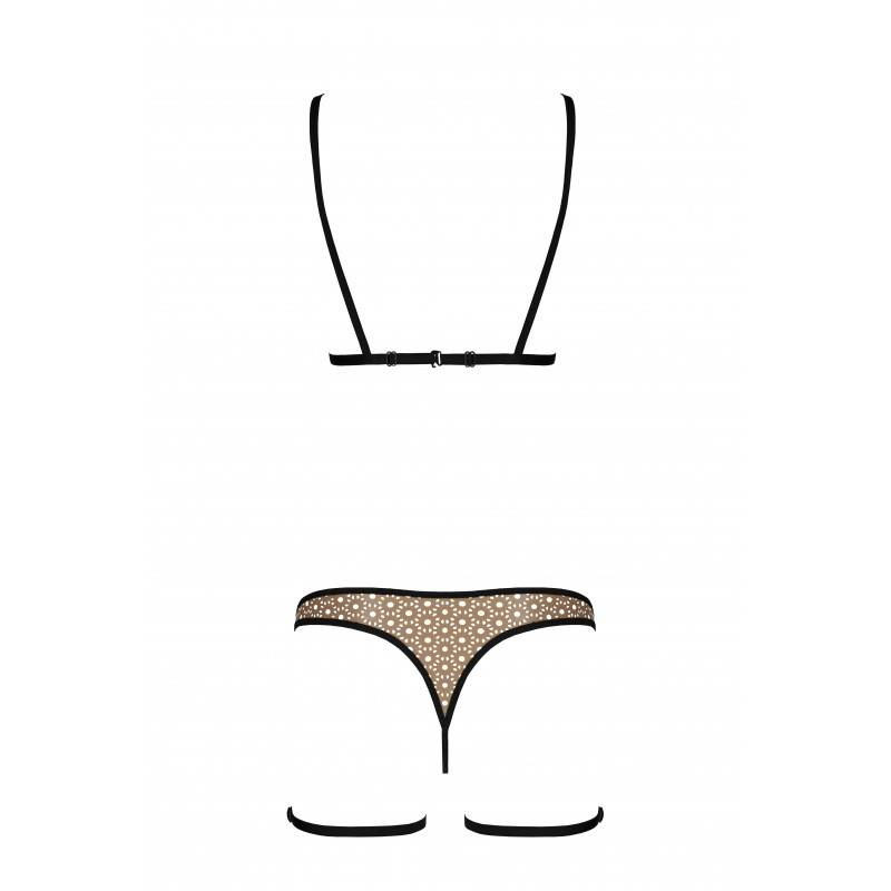 Come stimolare i sensi al massimo? Abolire l'elemento del desiderio in modo non ovvio. È proprio così che funziona il fenomenale set Gabi, i cui sensuali cut-out e le decorazioni traforate mettono in risalto il seno in modo fantasioso. Le cinghie alte fino alla coscia e le numerose articolazioni circolari creano un set unico nel suo genere.