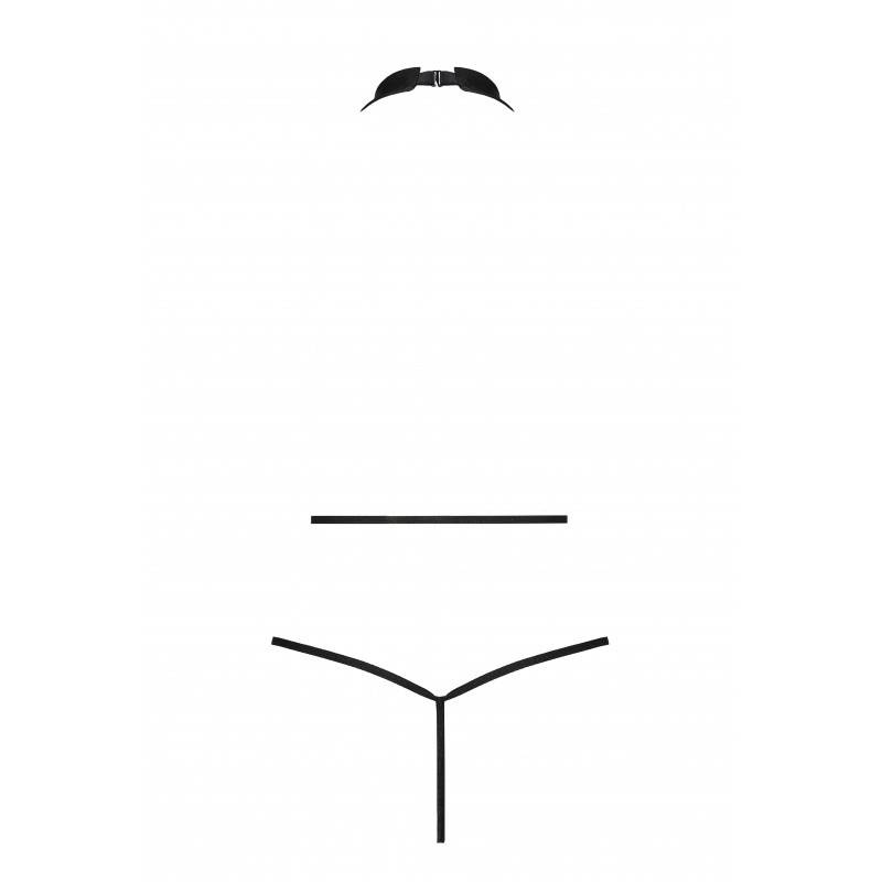 Originale body con chiusura al collo, maglie circolari e cinturini decorativi che aderiscono al corpo, in pelle nera.
