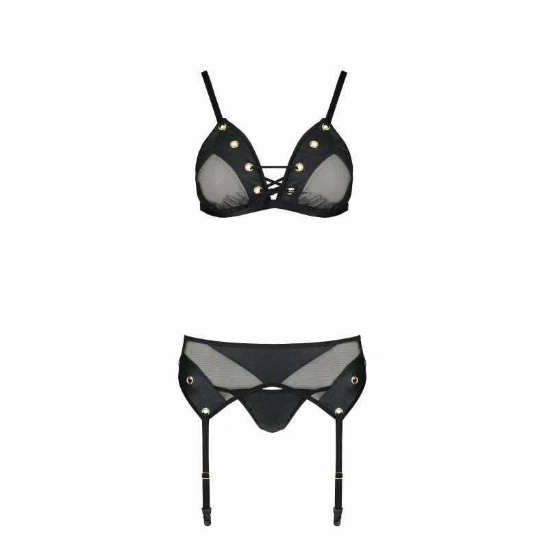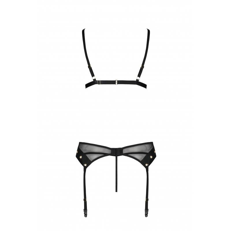 Il set, che combina tulle nero e pelle senza tempo, svela timidamente il corpo di una donna da sotto la lingerie, mentre la legatura del corsetto e i bottoni a pressione aggiungono fascino al set.