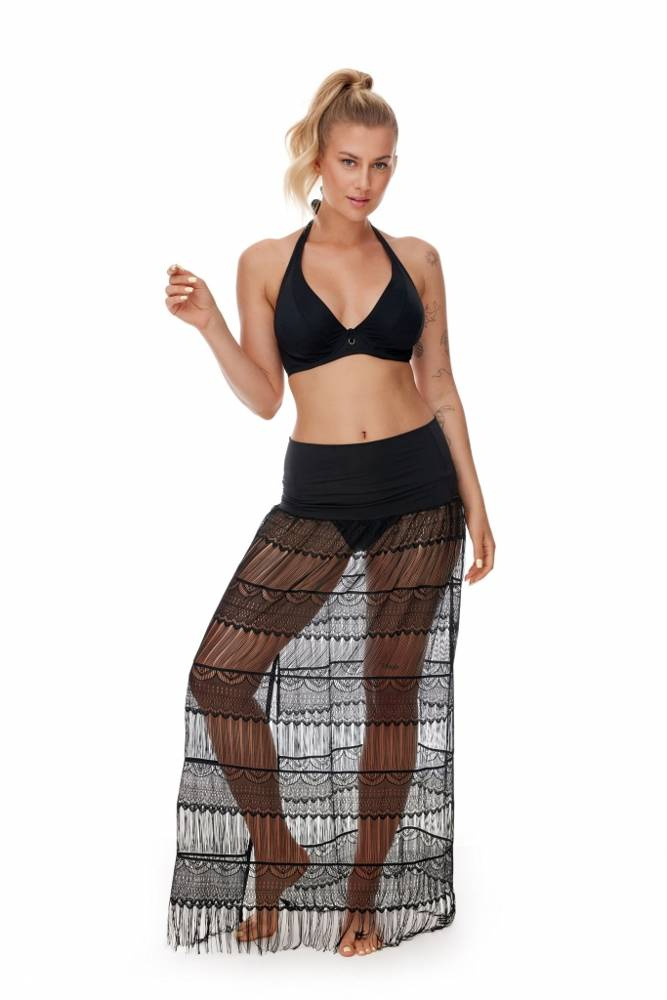 Pareo da spiaggia nero a forma di tunica in stile boho. Top elastico con scollo a fascia. Sezione della gonna in pizzo trasparente con un taglio civettuolo e rifinita con nappe. Può essere indossato in due modi, come abito o come gonna. Ideale per la spiaggia e come aggiunta a un outfit estivo.