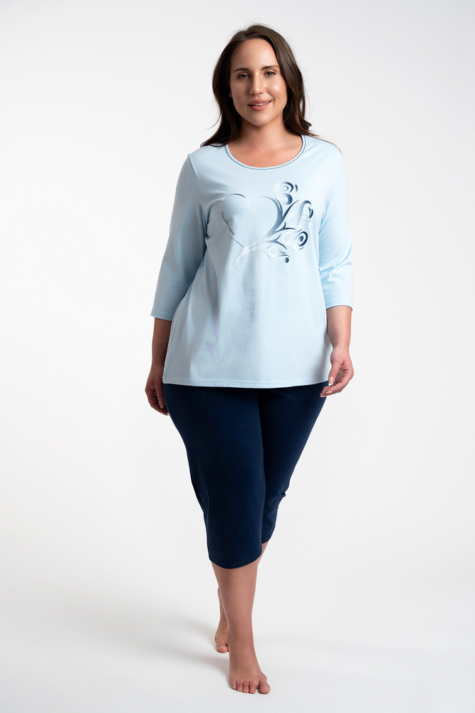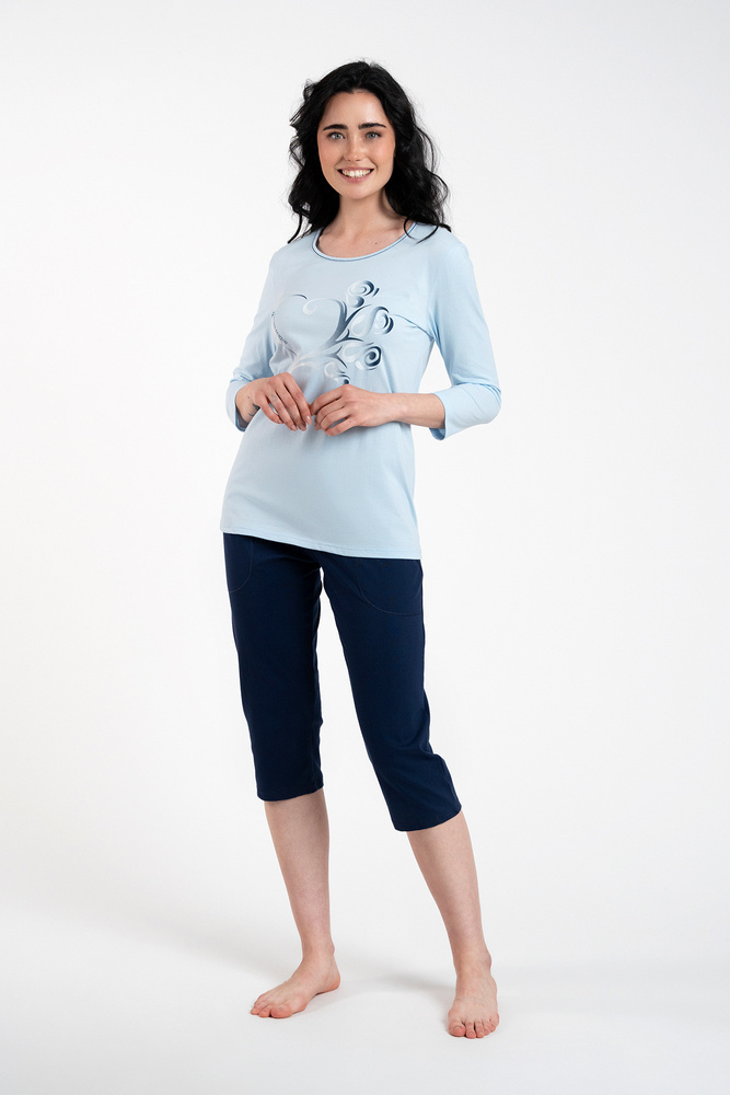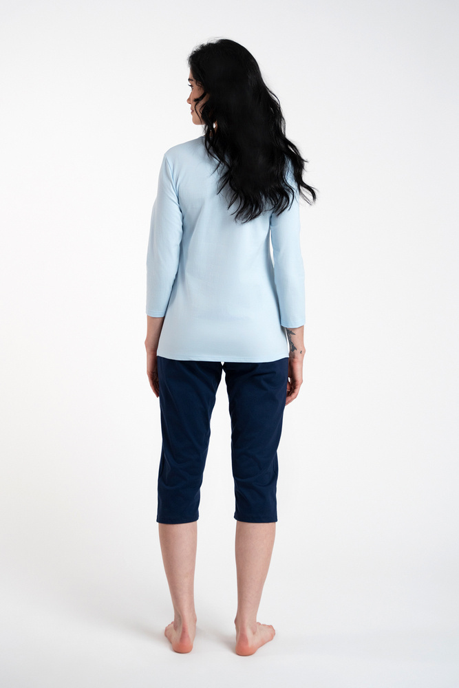 I pigiami da donna in bellissimi colori sono una scelta interessante per la prossima stagione. Pantaloni lisci blu navy a 3/4 con elastico in vita senza pressione per il massimo comfort e la libertà di movimento. Il top del pigiama è una blusa con maniche a 3/4. Si tratta di un motivo interessante e senza tempo che conferisce all'insieme un'espressione classica.